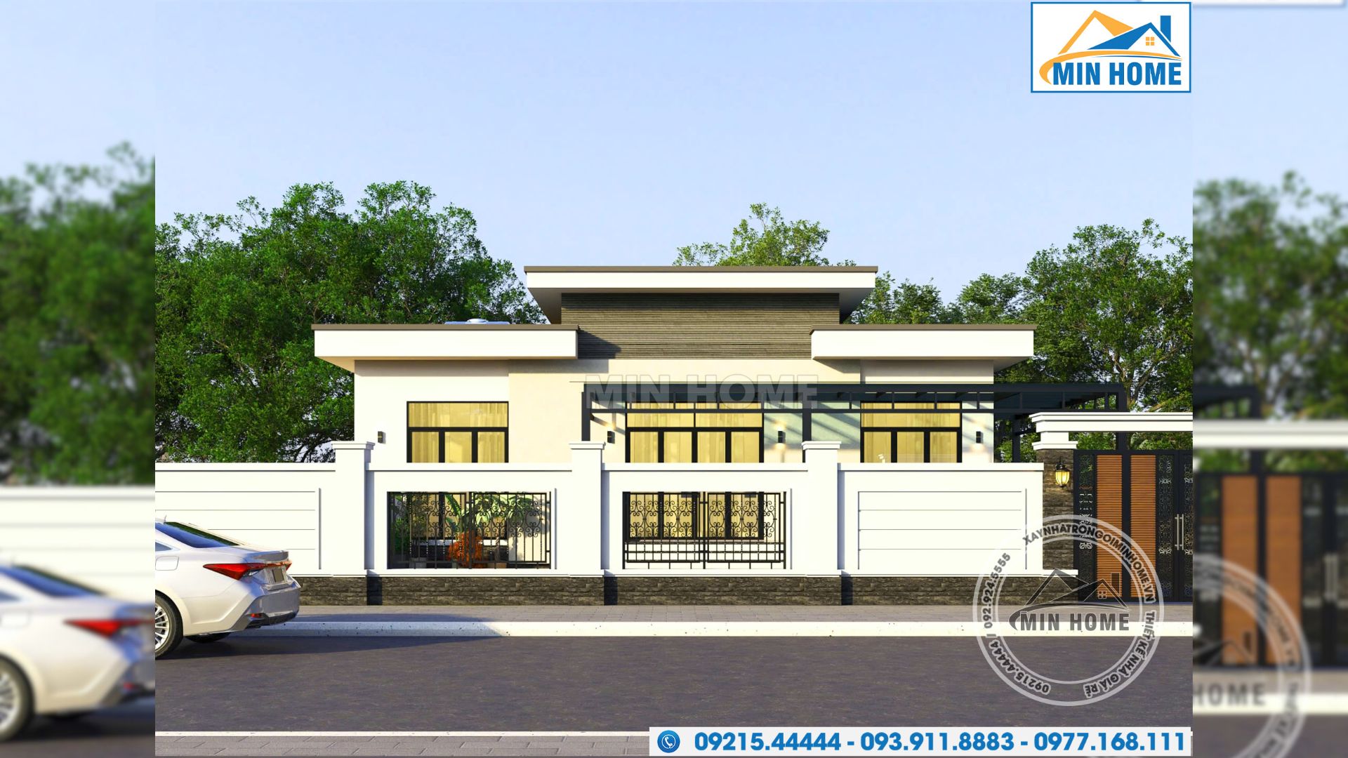 Ngôi nhà 1 tầng phong cách hiện đại gây ấn tượng mạnh mẽ với thiết kế mái bằng độc đáo, tạo nên dấu ấn kiến trúc riêng biệt, vừa tối giản nhưng đầy cuốn hút. Tổng thể công trình được tạo dựng từ những khối hình học gọn gàng, mạnh mẽ, kết hợp hài hòa với các đường nét thiết kế thanh thoát và vật liệu trang trí hiện đại, mang đến vẻ đẹp trẻ trung, phóng khoáng nhưng vẫn giữ được nét sang trọng tinh tế, đáp ứng trọn vẹn nhu cầu sống tiện nghi và đẳng cấp của gia đình hiện đại.