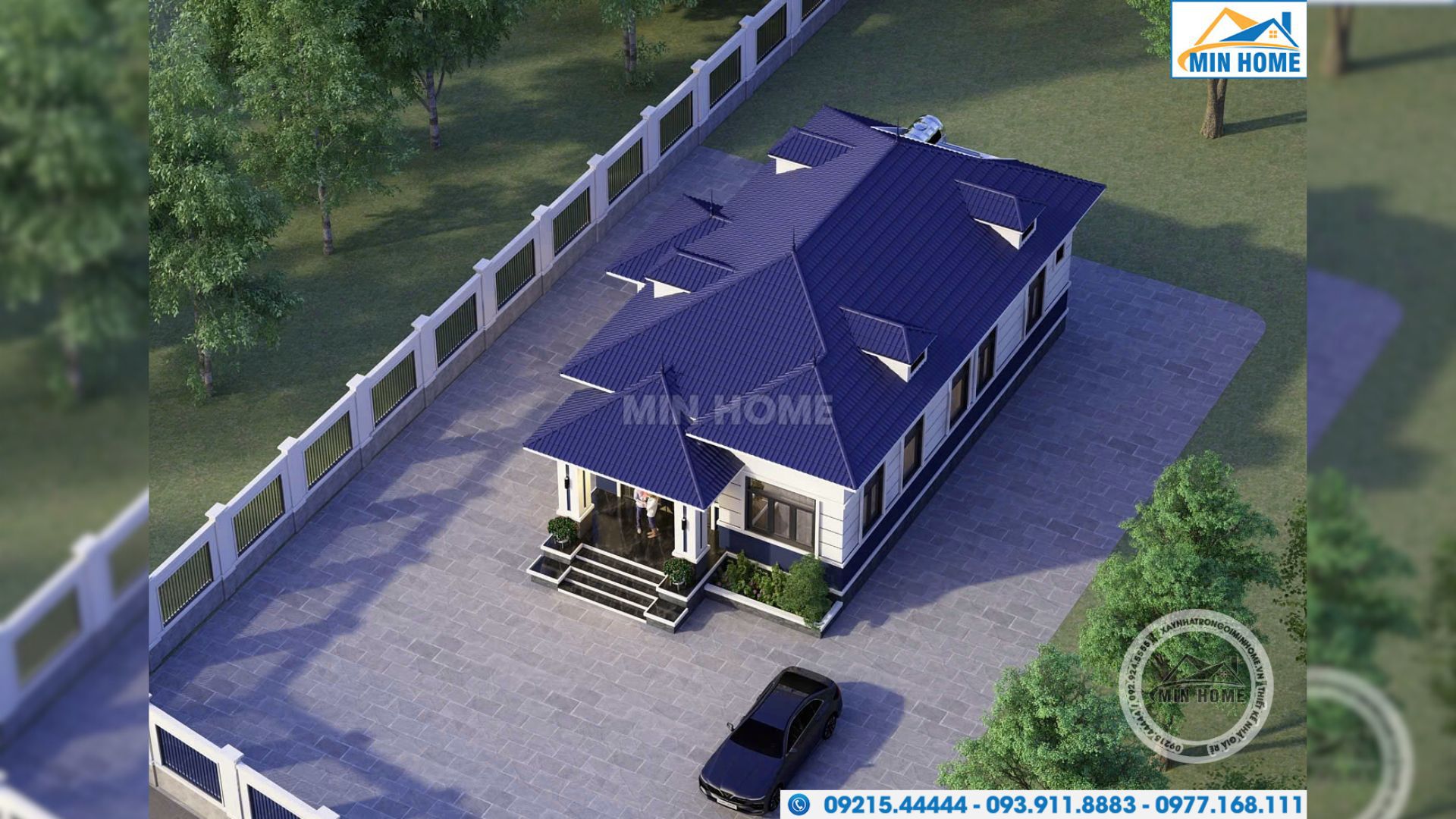 Với diện tích đất lý tưởng ngang 34,3m và sâu 61m, Min Home đã tư vấn gia chủ đặt ngôi nhà lùi sâu vào bên trong và cách chỉ giới đường đỏ 12m. Khoảng lùi này tạo nên một không gian đệm đắt giá để tạo ra khoảng sân chơi rộng rãi và giúp tách biệt không gian sống khỏi tiếng ồn, khói bụi của đường giao thông.