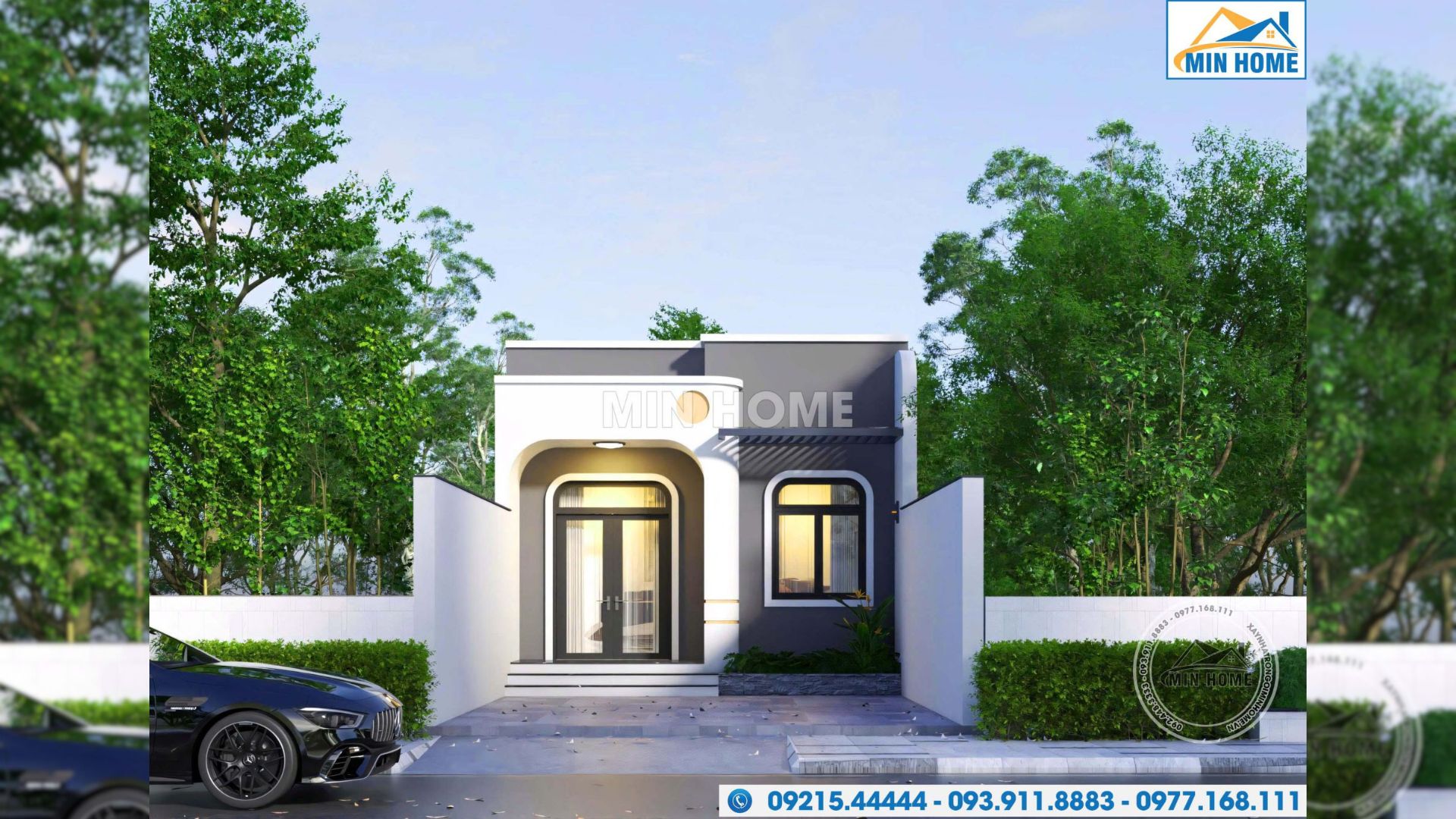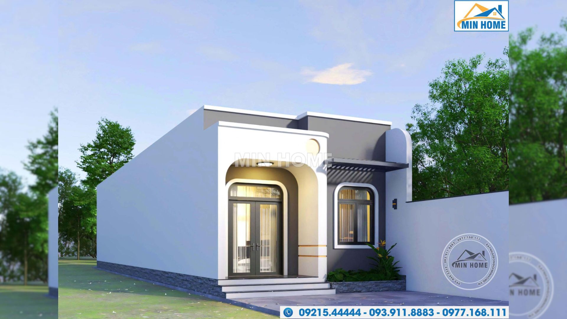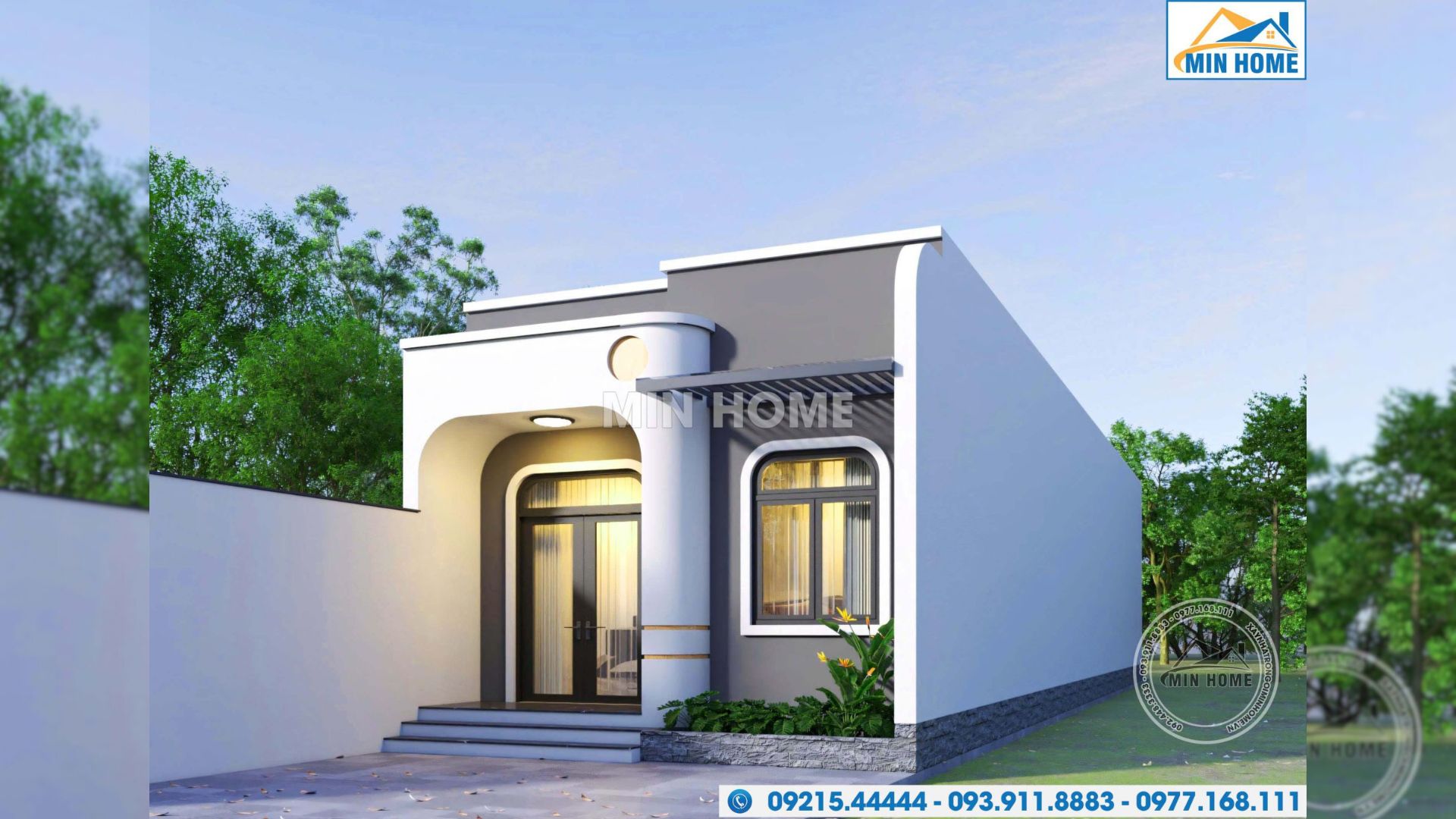 Không chỉ giới hạn trong những hình khối vuông vức đặc trưng của kiến trúc hiện đại, mẫu nhà 1 tầng mái bằng còn được xử lý khéo léo bằng các mảng tường bo cong mềm mại, tạo điểm nhấn tinh tế và mang lại cảm giác uyển chuyển cho tổng thể công trình. Sự kết hợp hài hòa giữa đường nét thẳng và cong giúp kiến trúc trở nên cân đối, nhẹ nhàng và có chiều sâu thẩm mỹ. Gam màu trắng được lựa chọn làm tông màu chủ đạo, phối hợp cùng sắc ghi ở các mảng tường nhấn, vừa tôn lên vẻ đẹp thanh lịch, hiện đại vừa góp phần làm nổi bật hình khối kiến trúc. Cách phối màu này không chỉ mang lại cảm giác sạch sẽ, sang trọng mà còn giúp công trình giữ được giá trị thẩm mỹ bền vững, hạn chế lỗi mốt theo thời gian.
