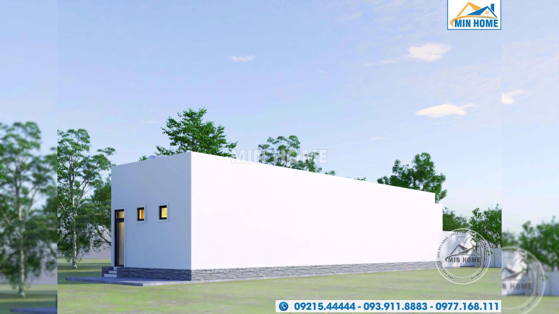 Mẫu nhà 1 tầng mái bằng được bố trí thêm cửa đi tại khu vực cuối nhà, đóng vai trò như cửa hậu, giúp việc di chuyển, lưu thông và tổ chức sinh hoạt hằng ngày trở nên linh hoạt, thuận tiện hơn. Giải pháp này đồng thời hỗ trợ thông gió tự nhiên, góp phần mang lại không gian sống thoáng mát và dễ chịu. Bên cạnh đó, toàn bộ phần chân tường xung quanh công trình được ốp đá chẻ tự nhiên, vừa tạo điểm nhấn thẩm mỹ mộc mạc, khỏe khoắn, vừa giúp bảo vệ bề mặt tường khỏi tác động của thời tiết. Lớp đá ốp có tác dụng hạn chế rêu mốc, ẩm bẩn, giảm xuống cấp theo thời gian, từ đó nâng cao độ bền và tuổi thọ cho ngôi nhà trong quá trình sử dụng lâu dài.