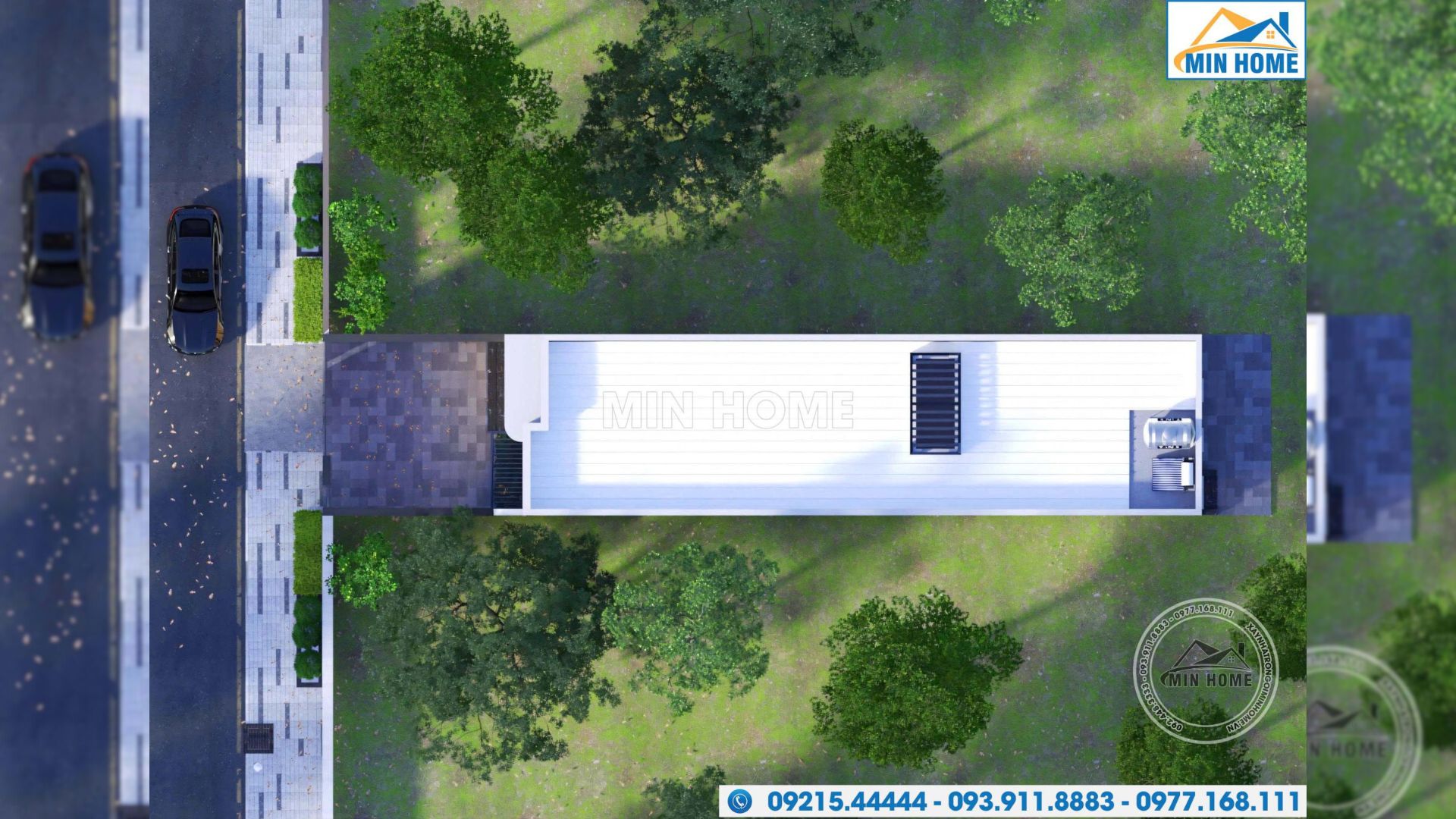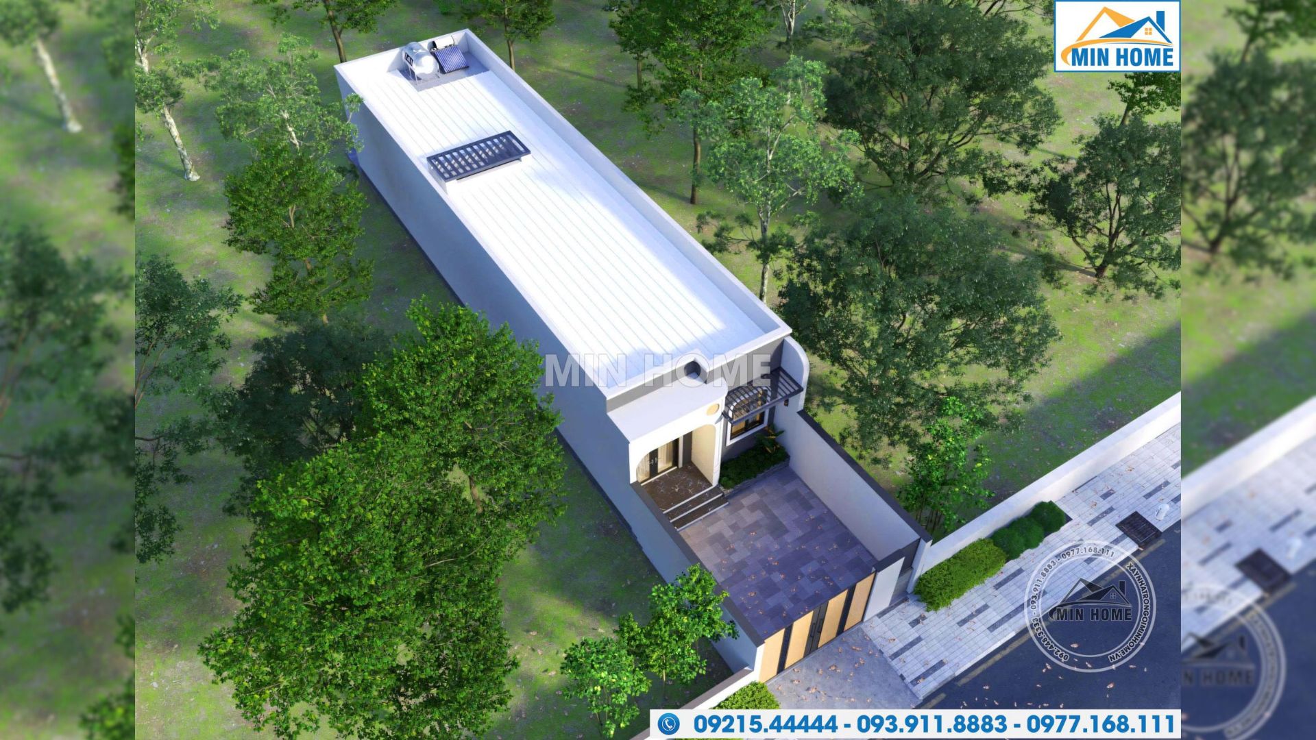 Quan sát từ góc nhìn trên cao, có thể thấy ngôi nhà 1 tầng được thiết kế theo phong cách mái bằng gọn gàng, hiện đại, với hình khối rõ ràng và bố cục mạch lạc. Phần mái được kết hợp sử dụng tôn chống nóng chất lượng cao, giúp hạn chế hấp thụ nhiệt từ môi trường bên ngoài, giữ cho không gian nội thất bên trong luôn mát mẻ và dễ chịu, đặc biệt trong những ngày thời tiết nắng nóng. Bên cạnh đó, hệ thống giếng trời được bố trí hợp lý tại các khu vực chức năng, góp phần tăng cường khả năng lấy sáng tự nhiên và lưu thông không khí. Giải pháp này không chỉ giúp ngôi nhà luôn thông thoáng, sáng sủa mà còn hỗ trợ tiết kiệm năng lượng, nâng cao chất lượng sinh hoạt hằng ngày và tạo cảm giác thoải mái lâu dài cho các thành viên trong gia đình.